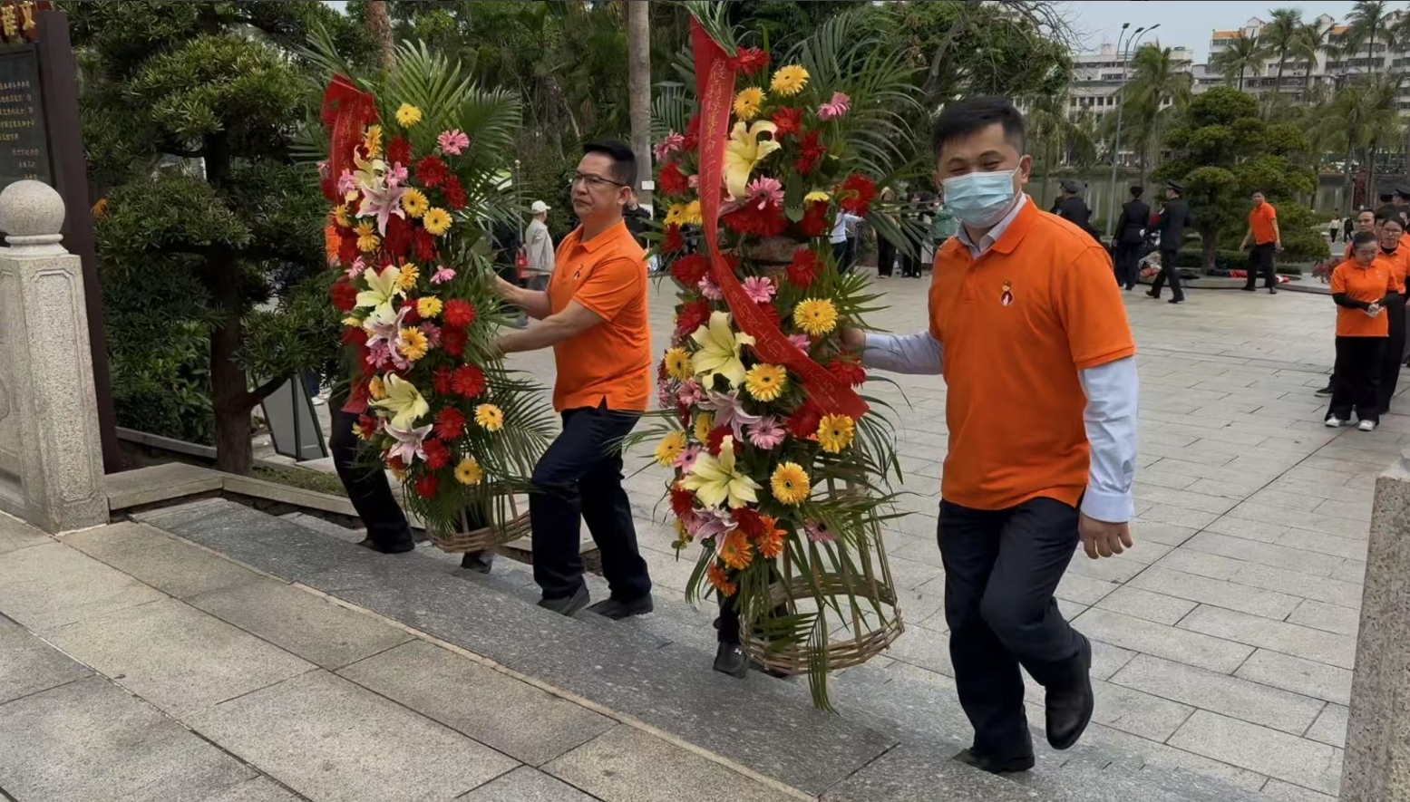 经过一段时间的等待才轮到红蓝。红蓝首先向烈士敬献花篮,花篮缎带上写着“为坚持琼崖革命23年红旗不倒牺牲的烈士们永垂不朽!”“为解放海南岛渡海牺牲的烈士们永垂不朽!”鲜艳的花篮寄托红蓝对革命先辈的崇敬和哀思。